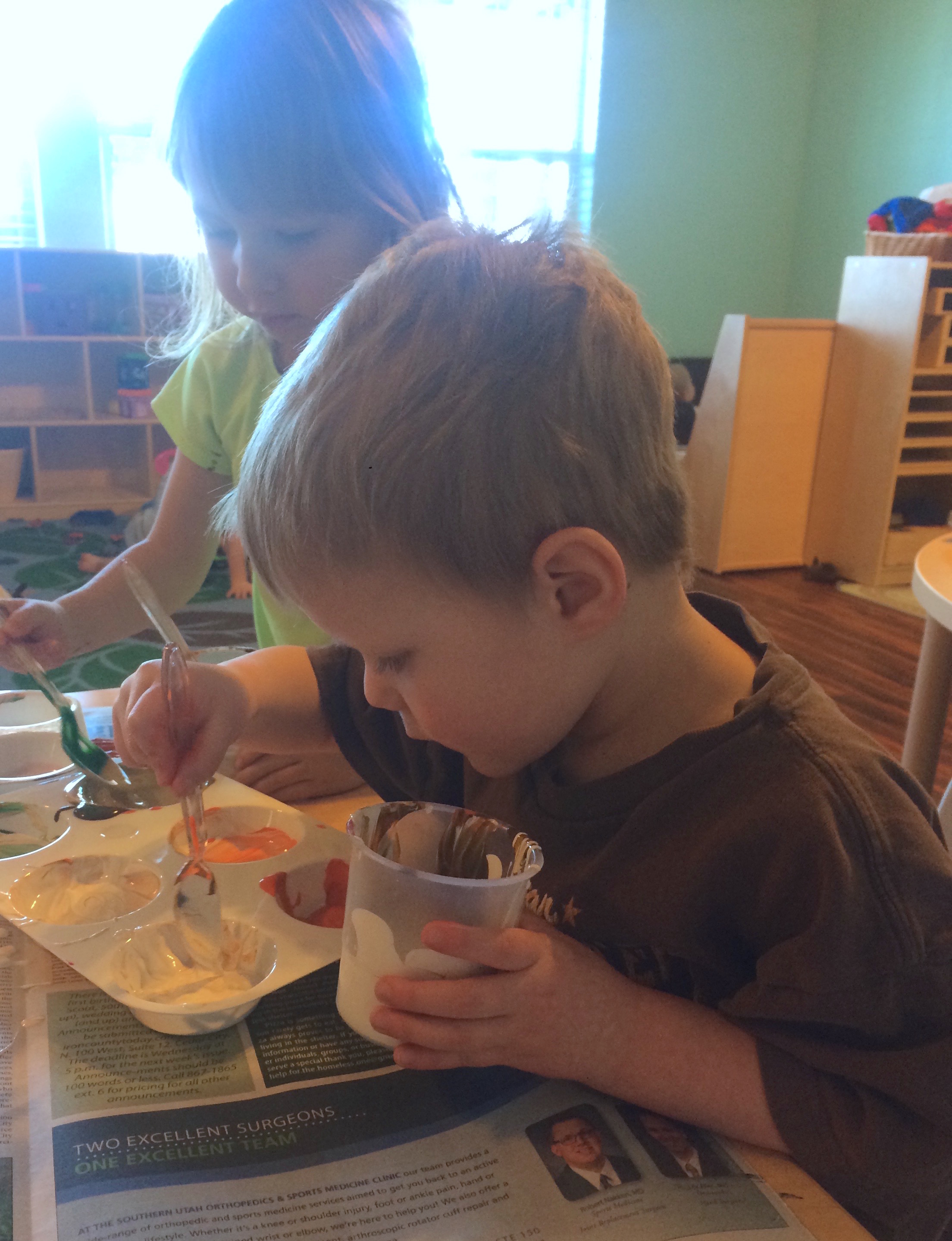 This invitation could not be simpler. Lay out plenty of newspaper on your surface. Place paint in cups on the table. Set out spoons for scooping the paint – I suggest 2-3 spoons per paint pot. Put out enough paint palettes or muffin tins for the children. As always an adult should be close by to support the kids, answer questions, and add materials. Most importantly – let the children own the process! Let them dip the spoon from cup to cup. Let them mix the worst colors together. Give up your idea of what they should be doing or learning and let them DISCOVER for themselves!